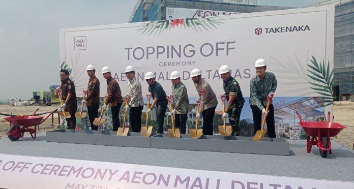 SUARATERKINI, Cikarang – PT. AMSL Deltamas melaksanakan prosesi Topping Off Ceremony untuk proyek ke-5 Aeon Mall di Indonesia, yang berada di Kota Deltamas, di sebelah timur Jabodetabek, tepatnya Cikarang Pusat, Selasa (30/5/2023). Topping Off Ceremony Aeon Mall Deltamas dihadiri langsung oleh Bupati Bekasi Dr. H. Dani Ramdan MT, Sinarmas Land, Sojitz Corporation dan PT. Takenaka Indonesia dan dihadiri oleh lebih dari 200 tamu undangan dari pemerintah, polisi, tenant, dan media.