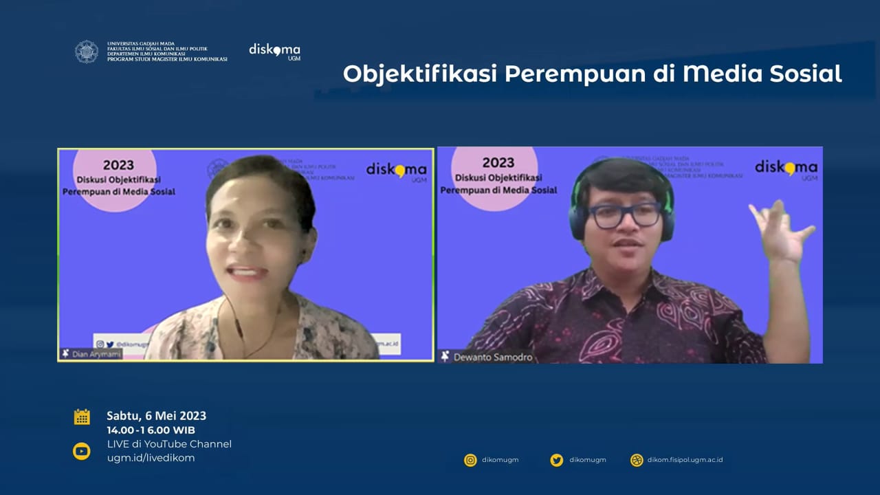 SUARATERKINI, Yogyakarta – Program Studi Magister Ilmu Komunikasi Universitas Gadjah Mada kembali menyelenggarakan diskusi komunikasi mahasiswa atau Diskoma Edisi ke 6 yang mengangkat topik “Objektifikasi Perempuan di Media sosial”. Diskusi diselenggarakan secara virtual pada hari Sabtu siang (6 Mei 2023). Dalam diskusi ini Diskoma menghadirkan narasumber Dewanto Samodro, M.I.Kom (Dosen Ilmu Komunikasi UPN Veteran Jakarta) dan Dr. Dian Arymami, S.I.P., M.Hum (Dosen Ilmu Komunikasi UGM). Diskusi dipandu oleh Muhammad Dimas Audi Nurapraja (Mahasiswa Magister Ilmu Komunikasi UGM).