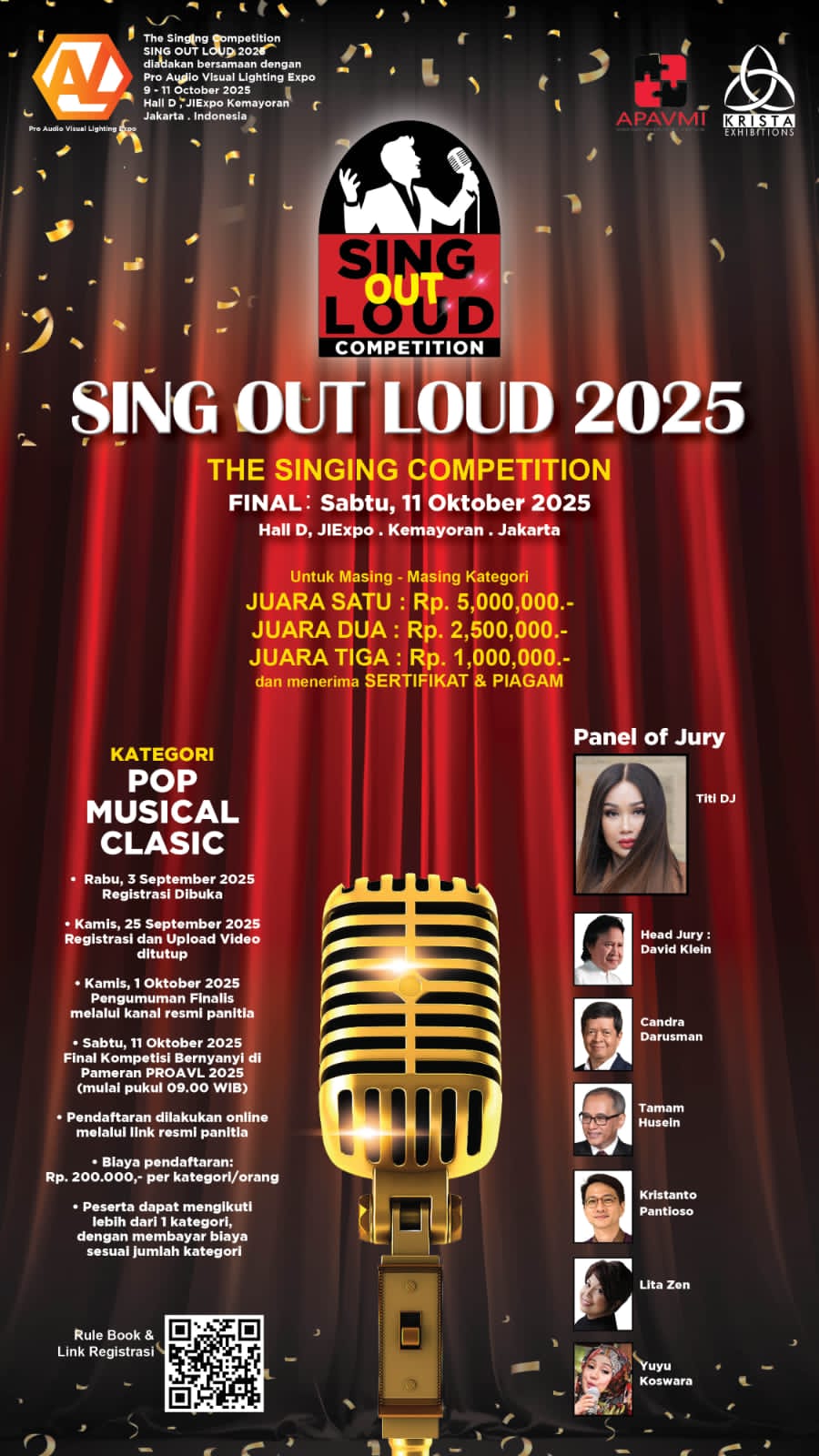 “Krista Exhibitions dengan bangga menghadirkan SING OUT LOUD 2025 sebagai bagian dari pameran PRO AVL Indonesia 2025. Kompetisi ini adalah kesempatan bagi talenta vokal muda maupun profesional untuk menunjukkan kemampuan terbaik mereka di panggung bergengsi.