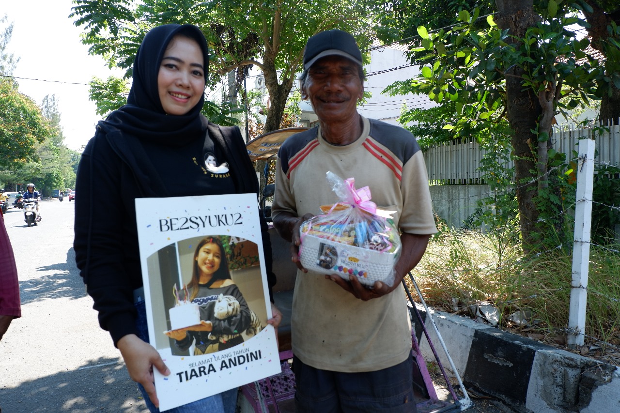 “Selamat Ulang Tahun Mbak Tiara Andini yang ke 22 tahun, semoga berkah, aamiin” ucap salah satu penerima hampers, saat dibagikan oleh salah satu tim Mootiara Surabaya yang berada di Jl. Diponegoro Surabaya.